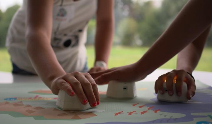 Photo by Dinesh DillenbourgWith the Cellulo project [6], a part of the Transversal Educational Activities of the NCCR Robotics, we introduced a new robotic platform which is small and easily deployable. A dotted pattern printed on regular paper enables the Cellulo robots with absolute localization with a precision of 270 microns [7]. The robots also have a new locomotion system with a drive relying on a permanent magnet to actuate coated metal balls [8]. This new drive design allows backdrivability; i.e. it allows the robot to move and to be moved without damaging it. With this system, we also implemented a haptic feedback modality, allowing the user to feel forces when grasping the robot [9]. The robots are connected via Bluetooth to a master (PC or tablet) that handles the logical and computation of the activity. The onboard PCB of the robots only allows for proceeding the localization (image capture and decoding of the pattern) and the control of the three wheels actuation. During two years, we developed several learning activities using the robots. The Figure for example shows the Feel the Wind activity, in which the learners were taught that the wind was formed by air moving from with high to low pressure points.
