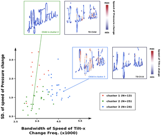 Handwriting is a complex skill to acquire and it requires years of training to be mastered. Children presenting dysgraphia exhibit difficulties automatizing their handwriting. This can bring anxiety and can negatively impact education. 280 children were recruited in schools and specialized clinics to perform the Concise Evaluation Scale for Children’s Handwriting (BHK) on digital tablets. Within this dataset, we identified children with dysgraphia. Twelve digital features describing handwriting through different aspects (static, kinematic, pressure and tilt) were extracted and used to create linear models to investigate handwriting acquisition throughout education. K-means clustering was performed to define a new classification of dysgraphia. Linear models show that three features only (two kinematic and one static) showed a significant association to predict change of handwriting quality in control children. Most kinematic and statics features interacted with age. Results suggest that children with dysgraphia do not simply differ from ones without dysgraphia by quantitative differences on the BHK scale but present a different development in terms of static, kinematic, pressure and tilt features. The K-means clustering yielded 3 clusters (Ci). Children in C1 presented mild dysgraphia usually not detected in schools whereas children in C2 and C3 exhibited severe dysgraphia. Notably, C2 contained individuals displaying abnormalities in term of kinematics and pressure whilst C3 regrouped children showing mainly tilt problems. The current results open new opportunities for automatic detection of children with dysgraphia in classroom. We also believe that the training of pressure and tilt may open new therapeutic opportunities through serious games.